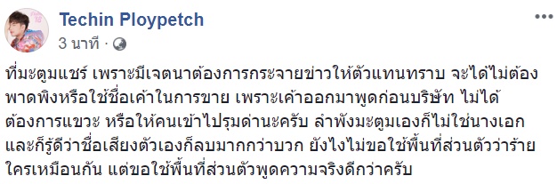 ก่อนที่จะลบโพสต์ดังกล่าวออกไป และโพสต์เพิ่มเติมว่า "ที่มะตูมแชร์ เพราะมีเจตนาต้องการกระจายข่าวให้ตัวแทนทราบ จะได้ไม่ต้องพาดพิงหรือใช้ชื่อเค้าในการขาย เพราะเค้าออกมาพูดก่อนบริษัท ไม่ได้ต้องการแขวะ หรือให้คนเข้าไปรุมด่านะครับ ลำพังมะตูมเองก็ไม่ใช่นางเอก และก็รู้ดีว่าชื่อเสียงตัวเองก็ลบมากกว่าบวก ยังไงไม่ขอใช้พื้นที่ส่วนตัวว่าร้ายใครเหมือนกัน แต่ขอใช้พื้นที่ส่วนตัวพูดความจริงดีกว่าครับ"