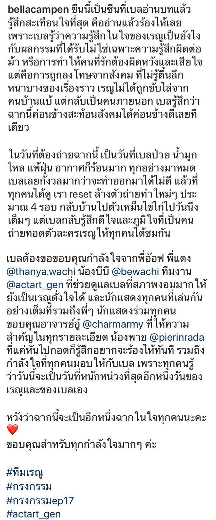 เบลต้องขอขอบคุณกำลังใจจากพี่อ๊อฟ พี่แดง น้องบีบี ทีมงาน ที่ช่วยดูแลเบลที่สภาพงอมมากให้ยังเป็นเรณูดั่งใจได้ และนักแสดงทุกคนที่เล่นกันอย่างเต็มที่รวมถึงพี่ ๆ นักแสดงร่วมทุกคน ขอบคุณอาจารย์อู๋ ที่ให้ความสำคัญในทุกรายละเอียด น้องพาย ที่แค่หันไปกอดก็รู้สึกอยากจะร้องไห้ทันที รวมถึงกำลังใจที่ทุกคนมอบให้กับเบล เพราะทุกคนรู้ว่าวันนี้จะเป็นวันที่หนักหน่วงที่สุดอีกหนึ่งวันของเรณูและของเบลเอง หวังว่าฉากนี้จะเป็นอีกหนึ่งฉากในใจทุกคนนะคะ ขอบคุณสำหรับทุกกำลังใจมาก ๆ ค่ะ