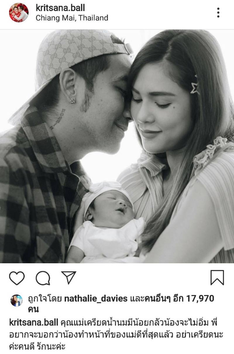 ล่าสุด บอล กฤษณะ คุณสามี ก็ได้ออกมาเผยภาพครอบครัวสุดอบอุ่น พร้อมให้กำลังใจด้วยข้อความซึ้ง ๆ หลังภรรยาคนสวยที่ตอนนี้เกิดอาการเครียดเพราะมีน้ำนมให้ลูกน้อยว่า "คุณแม่เครียดน้ำนมมีน้อยกลัวน้องจะไม่อิ่ม พี่อยากจะบอกว่า น้องทำหน้าที่ของแม่ดีที่สุดแล้ว อย่าเครียดนะคะคนดี รักนะคะ"