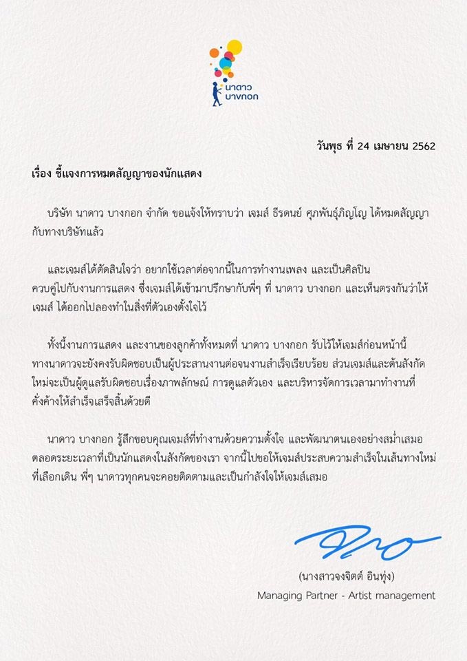 โดยล่าสุด (24 เมษายน 2562) นาดาว บางกอก ได้ออกหนังสือชี้แจง เรื่องการหมดสัญญาของเจมส์ ธีรดนย์ จากทางค่าย โดยระบุว่า เจมส์ได้ตัดสินใจว่าอยากใช้เวลาต่อจากนี้ทำงานเพลง และเป็นศิลปินควบคู่กับงานแสดง ซึ่งเจมส์ได้เข้ามาปรึกษาพี่ ๆ เห็นตรงกันว่าให้เจมส์ได้ออกไปลองทำให้สิ่งที่ตัวเองตั้งใจ