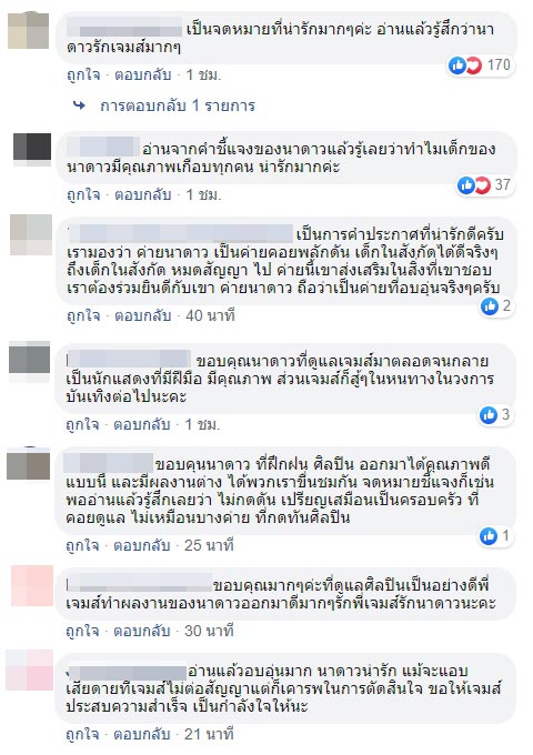 นาดาว บางกอก ขอบคุณเจมส์ที่ทำงานด้วยความตั้งใจ และพัฒนาตนเองอย่างสม่ำเสมอตลอดระยะเวลาที่เป็นนักแสดงในสังกัดของเรา จากนี้ขอให้เจมส์ประสบความสำเร็จในเส้นทางใหม่ที่เลือกเดิน พี่ ๆ นาดาวทุกคนจะคอยติดตามและเป็นกำลังใจให้เจมส์เสมอ