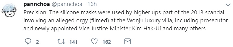 และล่าสุดทวิตเตอร์ @pannchoa ได้มีการเปิดเผยภาพหน้ากากซิลิโคนที่ถูกจัดหามาเตรียมไว้ให้ตำรวจ ซึ่งเป็นหนึ่งในแขกได้สวมใส่ก่อนเข้าห้อง VVIPs และหน้ากากเหล่านี้ใช้ในการถ่าย Snuff Film ด้วย