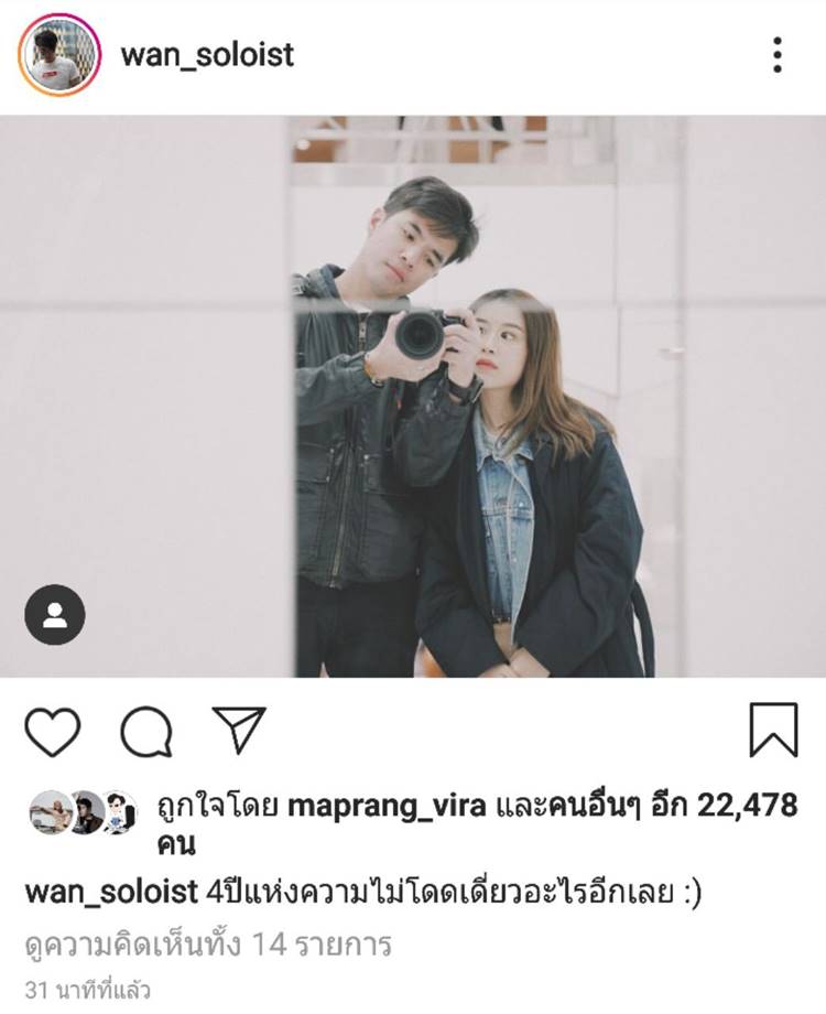 อย่างล่าสุด (26 เมษายน 2562) หนุ่มว่าน ก็ได้ออกมาเผยภาพคู่ให้ตามส่องกันเนื่องในโอกาสครบรอบที่คบหากันมา 4 ปี ซึ่งก็ต้องบอกเลยว่าเป็นภาพที่น่ารักมาก ๆ แถมยังมีแคปชั่นตามสไตล์หนุ่มว่านด้วยว่า "4 ปี แห่งความไม่โดดเดี่ยวอะไรอีกเลย" ทำเอาแฟน ๆ เข้ามาคอมเมนต์แซวความน่ารักกันเป็นแถว