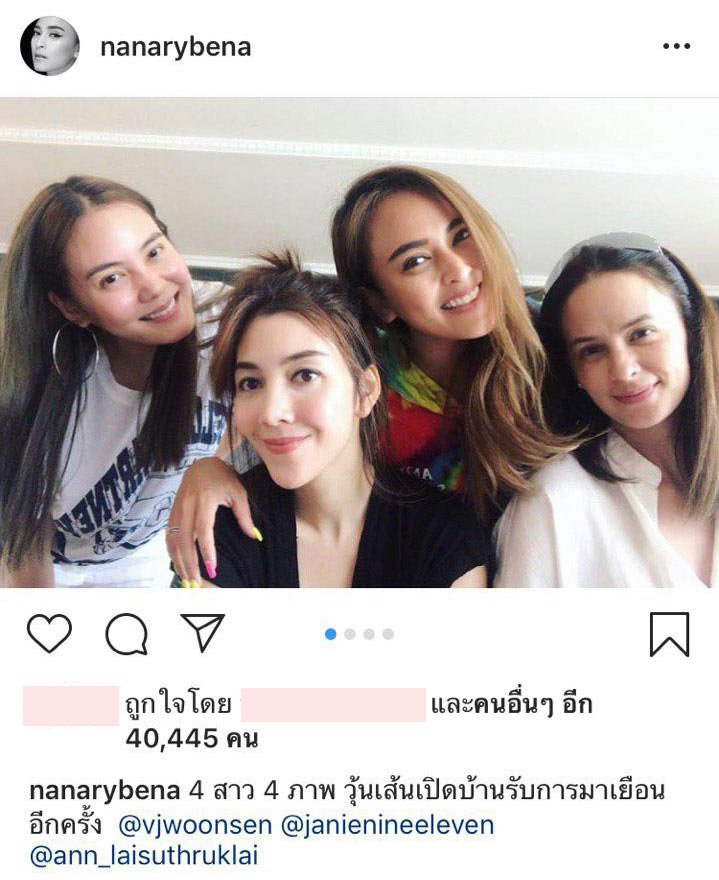 โดยก่อนหน้านี้ไม่กี่วัน นานา ก็เพิ่งมาเที่ยวคอนโดของวุ้นเส้น พร้อมกับสาวเจน เจนสุดา ซึ่งก็ได้เอ่ยปากชมไปแล้วว่า บ้านของวุ้นเส้นสวยหนักมาก ครั้งนี้จึงกลับมาอีกพร้อมกับชาวแก๊ง ซึ่งทุกคนก็รับประทานอาหารร่วมกัน นั่งเล่นพูดคุยกันอย่างสนุกสนาน มีภาพแซวเล่นกันลงสตอรี่ไอจี เฮฮากันตามประสาเพื่อนสาว นับเป็นมิตรภาพที่เหนียวแน่นจริง ๆ
