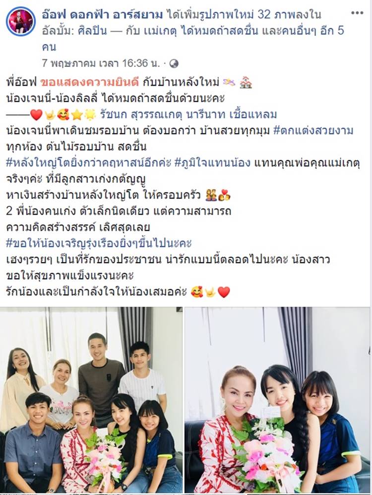 "พี่อ๊อฟ ขอแสดงความยินดี กับบ้านหลังใหม่ น้องเจนนี่-น้องลิลลี่ ได้หมดถ้าสดชื่นด้วยนะคะ รัชนก สุวรรณเกตุ นารีนาท เชื้อแหลม น้องเจนนี่พาเดินชมรอบบ้าน ต้องบอกว่า บ้านสวยทุกมุม #ตกแต่งสวยงาม ทุกห้อง ต้นไม้รอบบ้าน สดชื่น #หลังใหญ่โตยิ่งกว่าคฤหาสน์อีกค่ะ #ภูมิใจแทนน้อง แทนคุณพ่อคุณแม่เกตุ จริง ๆ ค่ะ ที่มีลูกสาวเก่งกตัญญู หาเงินสร้างบ้านหลังใหญ่โต ให้ครอบครัว 2 พี่น้องคนเก่ง ตัวเล็กนิดเดียว แต่ความสามารถ ความคิดสร้างสรรค์ เลิศสุดเลย #ขอให้น้องเจริญรุ่งเรืองยิ่งๆขึ้นไปนะคะ เฮง ๆ รวย ๆ เป็นที่รักของประชาชน น่ารักแบบนี้ตลอดไปนะคะ น้องสาว ขอให้สุขภาพแข็งแรงนะคะ รักน้องและเป็นกำลังใจให้น้องเสมอค่ะ"