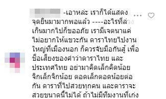 จากนั้น สาวคนนี้ก็เข้ามาบอกว่า ตนเองไม่ได้ต้องการให้ใครมาแขวะกัน ดาราไทยที่ไปควรจับมือกัน อย่ามาคิดเล็กคิดน้อย ตอดเล็กตอดน้อยกันเองเท่านั้น