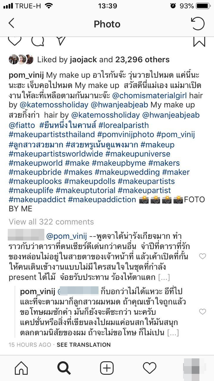 จากนั้น ก็มีคนเข้าไปโพสต์คอมเมนต์ถึงป้อม วินิจ ว่า พูดแบบนี้น่ารังเกียจมาก ทำอย่างกับดาราของตัวเองดีกว่าดาราของคนอื่นที่ไป จนป้อม วินิจ ทนไม่ไหว เข้ามาใส่คืนว่า "ขอโทษด้วยนะครับ ที่อาจจะไปแทงใจดำ ว่าแต่ใครเอ่ย ถุยยยยยยยยยย"