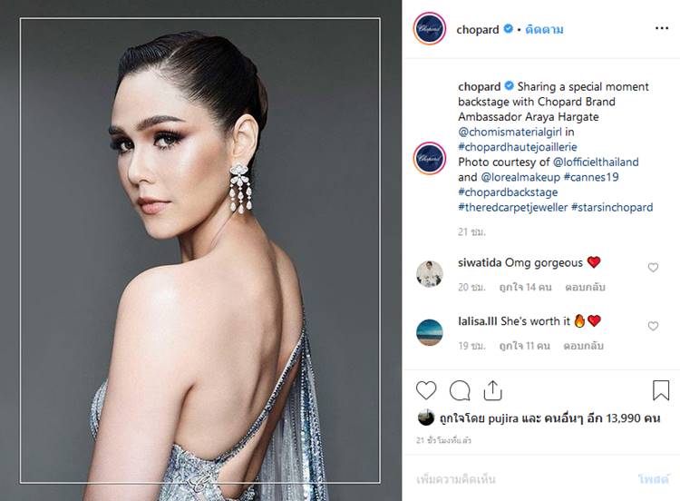 โดยแบรนด์เครื่องเพชร Chopard ถือเป็นแบรนด์ที่ สาวชมพู่ เลือกสวมใส่เครื่องประดับมาเสริมความเริดบนพรมแดงมาแล้วหลายปี ซึ่งเครื่องเพชรแต่ละชุดก็เลอค่ามาก ๆ และยิ่งปังเข้าไปอีกที่ในปีนี้ สาวชมพู่ ได้รับเลือกจาก Caroline Scheufele ผู้อำนวยการฝ่ายศิลป์และประธานร่วมของแบรนด์ Chopard ให้เธอเป็น Brand Ambassador คนล่าสุด