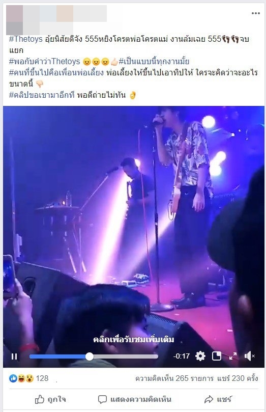 อย่างไรก็ตาม บนเฟซบุ๊ก หลวงพี่จัสติน วัดดูยูมีน ได้มีคนโพสต์นาทีที่ชายคนดังกล่าวบุกขึ้นเวที ในแบบใกล้ ๆ ซึ่งปรากฏภาพชายคนดังกล่าวถือแก้วเหล้าแล้วล็อกคอเดอะทอยส์ โดยหน้าแก้วเหล้ามีแบงก์พันเป็นจำนวนมากบังเอาไว้ ก่อนที่การ์ดจะขึ้นมาห้าม และเดอะทอยส์เองก็ไม่พอใจ โยนกีตาร์ทิ้งและเดินลงจากเวทีไปเลย