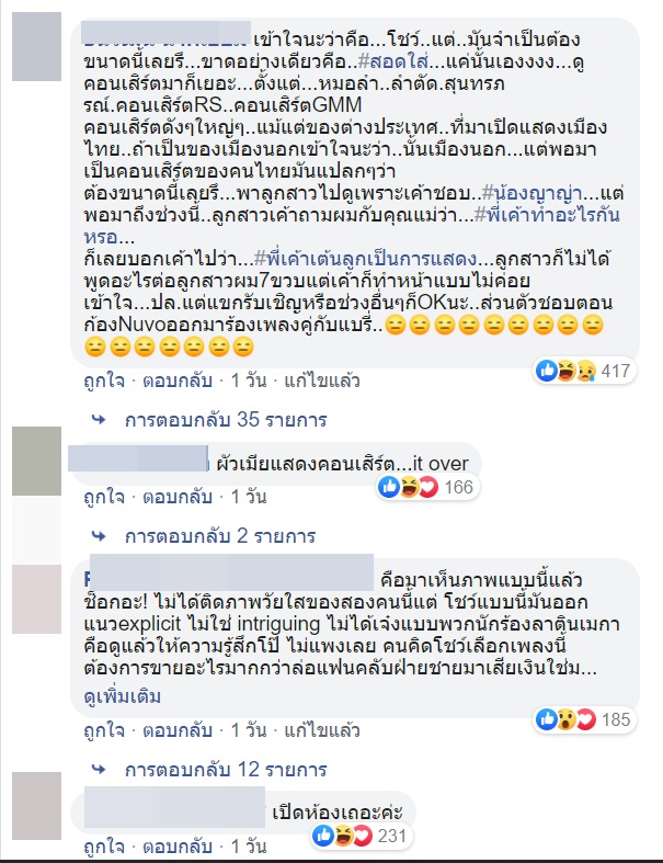 งานนี้ทำเอาชาวโซเชียลที่ได้เห็นภาพและคลิปจากโชว์ดังกล่าวหลายคนเข้ามาติติง โดยมองว่าโชว์ดังกล่าวดูแรงเกินไปหรือเปล่า กับท่าเต้น การแสดงออกทางอินเนอร์ รวมถึงคอสตูม ที่ดูค่อนข้างวาบหวิว ขณะที่บางคนบอกว่า คอนเสิร์ตน่าจะจำกัดเรตผู้ชมไปเลย หากจะมีโชว์แบบนี้ เพราะบางคนพาเด็กไปดูด้วยและรู้สึกว่าติดเรตเกินไป ดูไม่เหมาะสม อีกทั้งยังขัดกับภาพลักษณ์ของทั้งคู่