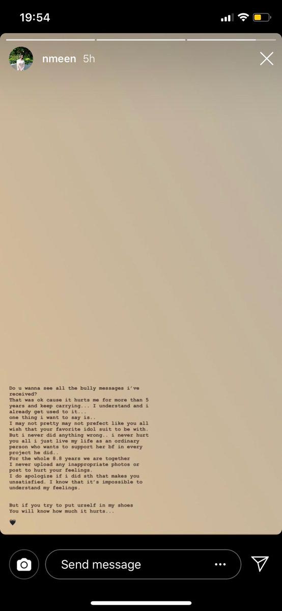 ตลอดเวลา 8 ปี ที่เราอยู่ด้วยกันมา ฉันไม่เคยอัปโหลดรูปที่ไม่งาม ไม่เหมาะสม หรือทำร้ายจิตใจใครเลย ฉันขอโทษด้วยหากทำอะไรให้คุณไม่พอใจ ฉันรู้ว่าเป็นเรื่องที่เป็นไปไม่ได้เลยที่จะเข้าใจความรู้สึกของฉัน