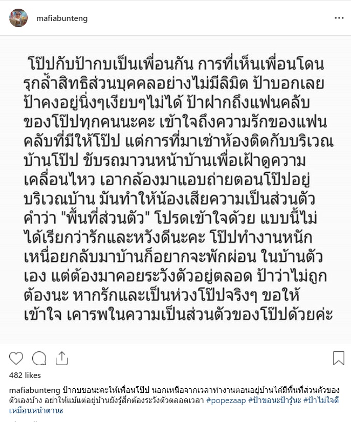 "โป๊ปกับป้ากบเป็นเพื่อนกัน การที่เห็นเพื่อนโดนรุกล้ำสิทธิส่วนบุคคลอย่างไม่มีลิมิต ป้าบอกเลยป้าคงอยู่นิ่ง ๆ เงียบ ๆ ไม่ได้ ป้าฝากถึงแฟนคลับของโป๊ปทุกคนนะคะ เข้าใจถึงความรักของแฟนคลับที่มีให้โป๊ป แต่การที่มาเช่าห้องติดกับบริเวณบ้านโป๊ป ขับรถมาวนหน้าบ้านเพื่อเฝ้าดูความเคลื่อนไหว เอากล้องมาแอบถ่ายตอนโป๊ปอยู่บริเวณบ้าน มันทำให้น้องเสียความเป็นส่วนตัว คำว่า "พื้นที่ส่วนตัว" โปรดเข้าใจด้วย แบบนี้ไม่ได้เรียกว่ารักและหวังดีนะคะ โป๊ปทำงานหนักเหนื่อยกลับมาบ้านก็อยากจะพักผ่อน ในบ้านตัวเอง แต่ต้องมาคอยระวังตัวอยู่ตลอด ป้าว่าไม่ถูกต้องนะ หากรักและเป็นห่วงโป๊ปจริง ๆ ขอให้เข้าใจ เคารพในความเป็นส่วนตัวของโป๊ปด้วยค่ะ"
