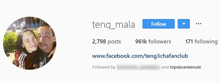 นอกจาก มาลา จะอัปรูปคู่ลงอินสตาแกรม แชร์ความหวานแบบรัว ๆ แล้ว ล่าสุด เมื่อวันที่ 31 พฤษภาคม 2562 นั้น พบว่าแอคเคาท์ของ มาลา ได้มีการเปลี่ยนแปลงชื่อ จากเดิมที่ชื่อ mala_chimi ไปเป็น teng_mala ซึ่งเป็นการผสมชื่อของตัวเองและสามีอยู่ด้วยกัน น่ารักสุด ๆ