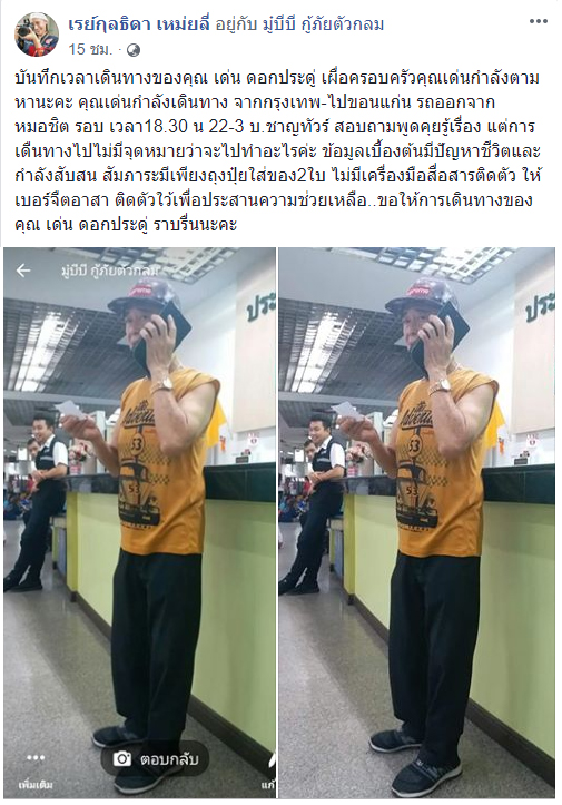 สอบถามพูดคุยรู้เรื่อง แต่การเดินทางไปไม่มีจุดหมายว่าจะไปทำอะไร ข้อมูลเบื้องต้นมีปัญหาชีวิตและกำลังสับสน สัมภาระมีเพียงถุงปุ๋ยใส่ของ 2 ใบ ไม่มีเครื่องมือสื่อสารติดตัว ตนให้เบอร์จิตอาสาติดตัวไว้ เพื่อประสานความช่วยเหลือ ขอให้การเดินทางของคุณ เด่น ดอกประดู่ ราบรื่น