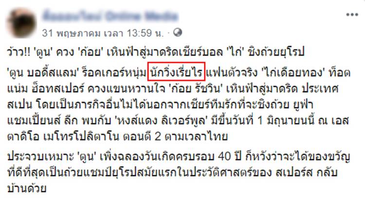 เดินทางไปเชียร์ทีมโปรดติดขอบสนาม สำหรับนักร้องหนุ่ม ตูน บอดี้สแลม แฟนบอลสโมสร ท็อตแน่ม ฮ็อทสเปอร์ส ที่ควงคู่แฟนสาว ก้อย รัชวิน บินลัดฟ้าไปร่วมชมฟุตบอลนัดชิงชนะเลิศ ศึกยูฟ่า แชมเปียนส์ ลีก ที่กรุงมาดริด ประเทศสเปน