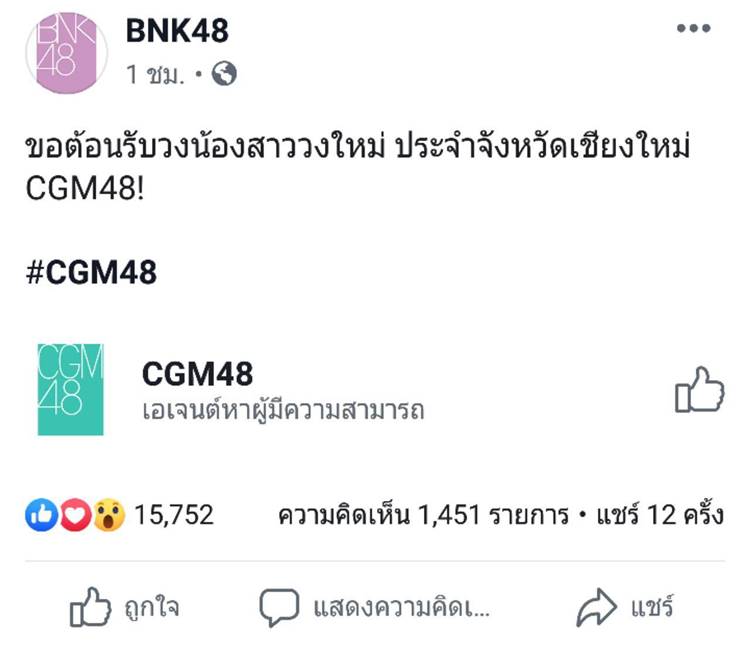 แต่ล่าสุด (2 มิถุนายน 2562) ก็ทำเอาแฟน ๆ ฮือฮากันเป็นแถว ๆ เมื่อมีการประกาศข่าวเซอร์ไพรส์ในงานอีเวนต์ของ BNK48 ที่ จ.เชียงใหม่ กับการประกาศว่าประเทศไทยจะมียูนิตใหม่ของ 48 Group พร้อมเปิดตัววง CGM48 หรือ เชียงใหม่ 48 วงน้องสาวอันดับที่ 2 ของประเทศไทย ที่จะอิงระบบวงเหมือนกับพี่ ๆ ในประเทศอื่น ๆ ซึ่ง CGM48 จะมีฐานและเน้นการทำกิจกรรมที่ จ.เชียงใหม่