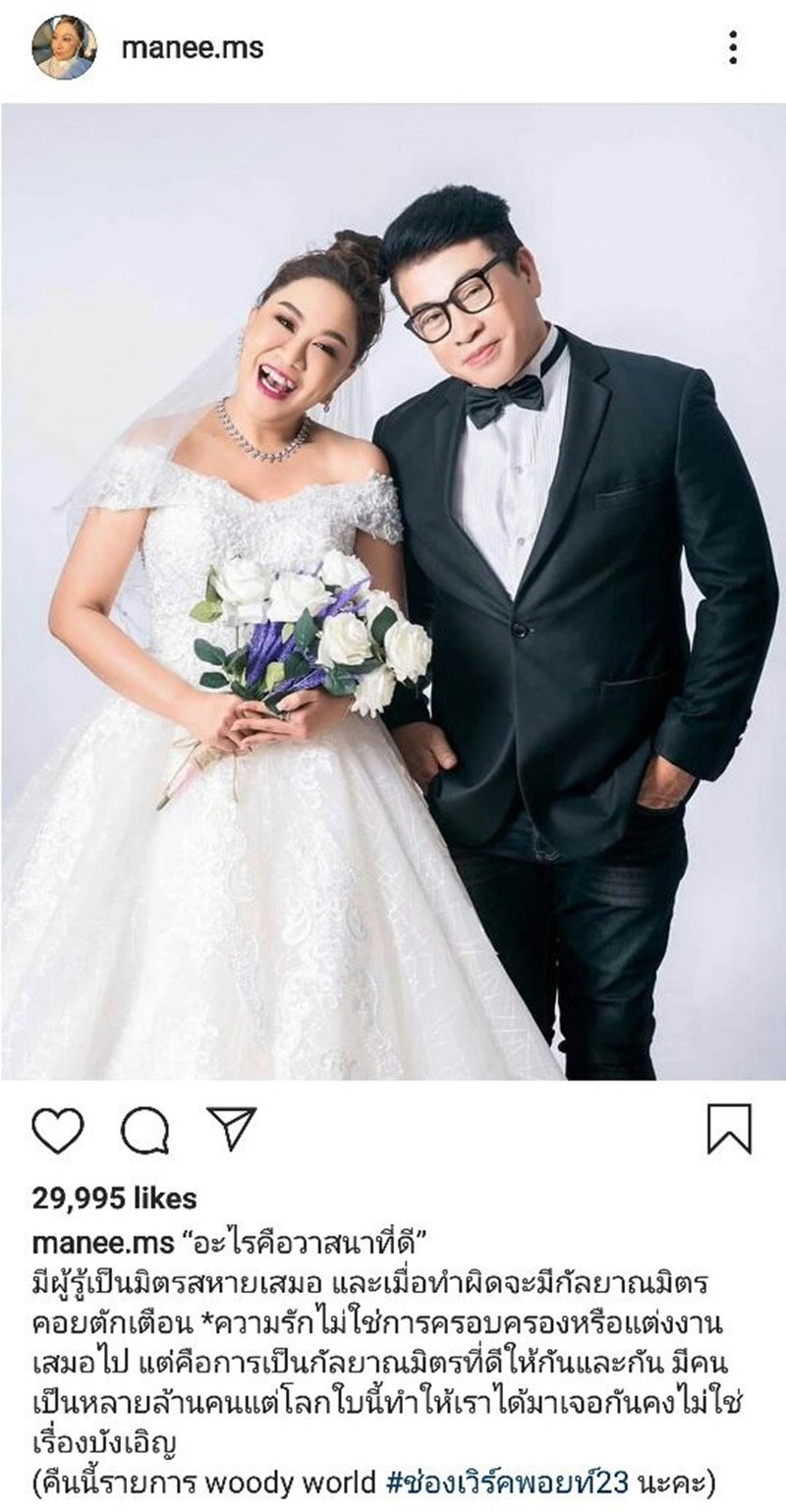เรียกได้ว่าเป็นโมเมนต์แสนพิเศษและมีความหมายเป็นอย่างมาก สำหรับ ครูอ้วน มณีนุช ที่ทางรายการ Woody World พาไปเลือกชุดเจ้าสาวสำหรับถ่ายพรีเวดดิ้ง ให้ความฝันในการได้สวมชุดแต่งงานสวย ๆ กลายเป็นความจริง ซึ่งทางรายการก็ได้จัดเตรียมเจ้าบ่าวสุดเซอร์ไพรส์เอาไว้ให้ ซึ่งก็ไม่ใช่ใครที่ไหน แต่เป็น อาจารย์เชน จตุพล นั่นเอง (อ่านข่าว : ฝันเป็นจริง ครูอ้วน มณีนุช สวมชุดเจ้าสาว ถ่ายพรีเวดดิ้งร่วมเจ้าบ่าวสุดเซอร์ไพรส์)