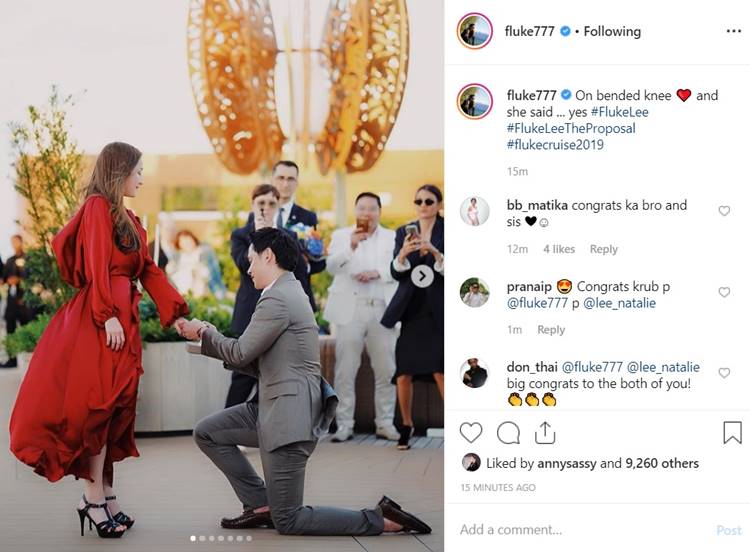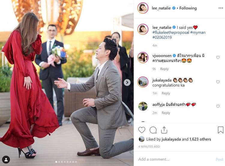 งานนี้ก็มีเพื่อน ๆ ในวงการ และแฟน ๆ เข้ามาคอมเมนต์แสดงความยินดีกันเพียบ ทางด้านสาว ลี นาตาลี ก็ได้เผยโมเมนต์ดังกล่าวลง IG เช่นกัน พร้อมเผยว่า "I said yes #flukeleetheproposal #myman #02062019"