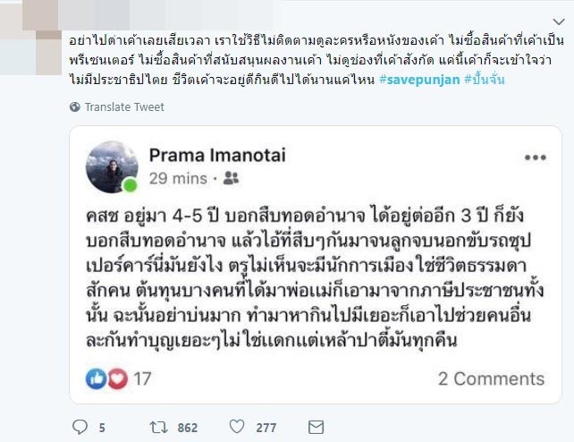 กลายเป็นประเด็นที่ฮอตฮิตข้ามวันกันเลยทีเดียว กับกรณีที่ ปั้นจั่น ปรมะ ได้ออกมาโพสต์ข้อความบนเฟซบุ๊ก ว่านักการเมืองคนอื่นก็สืบทอดอำนาจ ไม่ใช่แค่ คสช. พร้อมไล่ให้ทุกคนอย่าบ่น ทำมาหากิน แล้วเอาเงินไปทำบุญ ไม่ใช่เอาเงินไปกินเหล้า จนกลายเป็นเรื่องเดือดดาลทั่วโซเชียล มีการติดแฮชแท็ก #savepunjan #ปั้นจั่น จนฮิตติดเทรนด์ (อ่านเพิ่มเติม ปั้นจั่น ปรมะ ลั่นรัฐบาลไหนก็สืบทอดอำนาจ อย่าบ่นมาก ทำมาหากินไป)