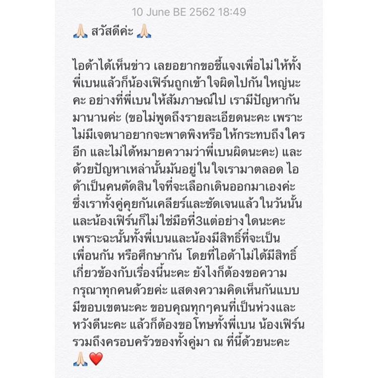 "สวัสดีค่ะ ไอด้าได้เห็นข่าว เลยอยากขอชี้แจงเพื่อไม่ให้ทั้งพี่เบนแล้วก็น้องเฟิร์นถูกเข้าใจผิดไปกันใหญ่นะคะ อย่างที่พี่เบนให้สัมภาษณ์ไป เรามีปัญหากันมานานค่ะ (ขอไม่พูดถึงรายละเอียดนะคะ เพราะไม่มีเจตนาอยากจะพาดพิงหรือให้กระทบถึงใครอีก และไม่ได้หมายความว่าพี่เบ็นผิดนะคะ) และด้วยปัญหาเหล่านั้นมันอยู่ในใจเรามาตลอด ไอด้าเป็นคนตัดสินใจจะเลือกเดินออกมาเองค่ะ ซึ่งเราทั้งคู่คุยกันเคลียร์และชัดเจนแล้วในวันนั้น และน้องเฟิร์นก็ไม่ใช่มือที่สามแต่อย่างใดนะคะ เพราะฉะนั้นทั้งพี่เบนและน้องมีสิทธิ์ที่จะเป็นเพื่อนกัน หรือศึกษากัน โดยที่ไอด้าไม่ได้มีสิทธิ์เกี่ยวข้องกับเรื่องนี้นะคะ ยังไงก็ต้องขอความกรุณาทุกคนด้วยค่ะ แสดงความคิดเห็นกันแบบมีขอบเขตนะคะ ขอบคุณทุก ๆ คนที่เป็นห่วงและหวังดีนะคะ แล้วก็ต้องขอโทษทั้งพี่เบน น้องเฟิร์น รวมถึงครอบครัวของทั้งคู่มา ณ ที่นี้ด้วยนะคะ"
