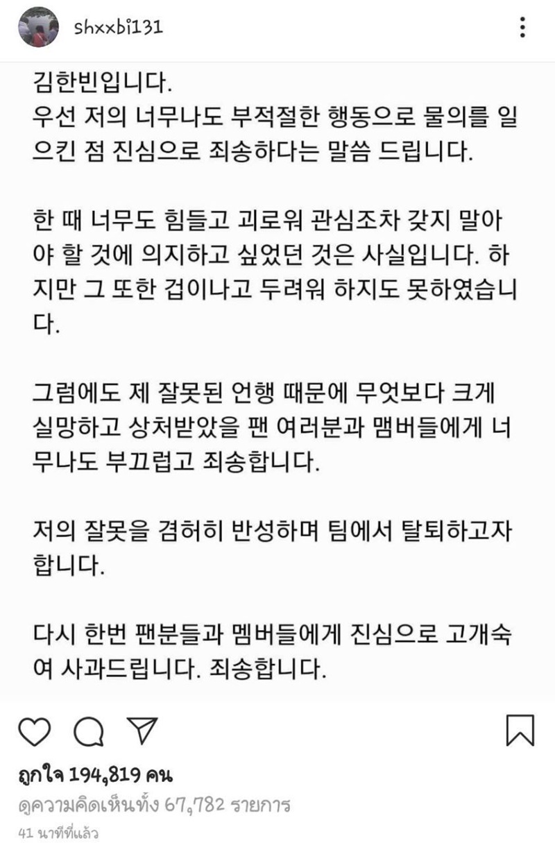 ผมจึงรู้สึกละอายใจและอยากขอโทษต่อแฟน ๆ ที่รู้สึกไม่พอใจและเจ็บปวดจากถ้อยคำและการกระทำที่ไม่เหมาะสมของผม ผมตั้งใจที่จะสำนึกผิดในความผิดพลาดของผมและขอออกจากทีม