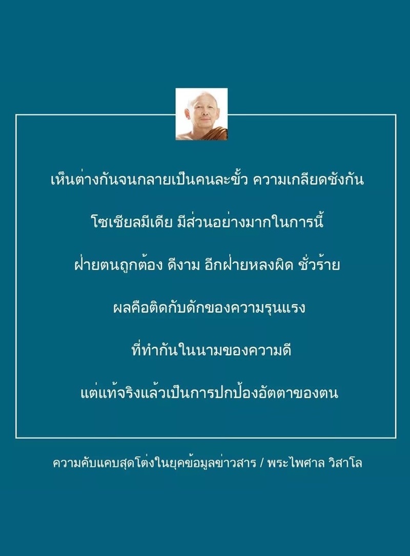 "เห็นต่างกันจนกลายเป็นคนละขั้ว ความเกลียดชังกัน โซเชียลมีเดีย มีส่วนอย่างมากในการนี้ ฝ่ายตนถูกต้อง ดีงาม อีกฝ่ายหลงผิด ชั่วร้าย ผลคือติดกับดักของความรุนแรง ที่ทำกันในนามของความดี แต่แท้จริงแล้วเป็นการปกป้องอัตตาของตน"