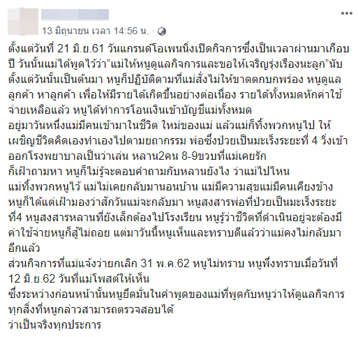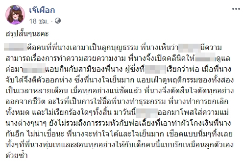 โดยระบุว่า ศิริพร เห็นว่า อร (นามสมมติ) ลูกบุญธรรม มีความสามารถเรื่องการทำความสวยความงาม จึงเปิดคลินิกให้ดูแล ต่อมาอรแอบกินกับสามีของศิริพร ผู้ซึ่งเรียกว่าพ่อ เมื่อศิริพรจับได้ก็ตีตัวออกห่าง แต่ก็ใจเย็นมาก แอบเฝ้าดูพฤติกรรมของทั้ง 2 คนมาหลายเดือน และเมื่อทุกอย่างแน่ชัดแล้ว ศิริพรจึงตัดทุกอย่างออกจากชีวิต อะไรที่เป็นการใช้ชื่อ ศิริพร ทำธุรกิจ ธุรกรรม ก็ทำการยกเลิกทั้งหมด และไม่เรียกร้องใด ๆ ทั้งสิ้น