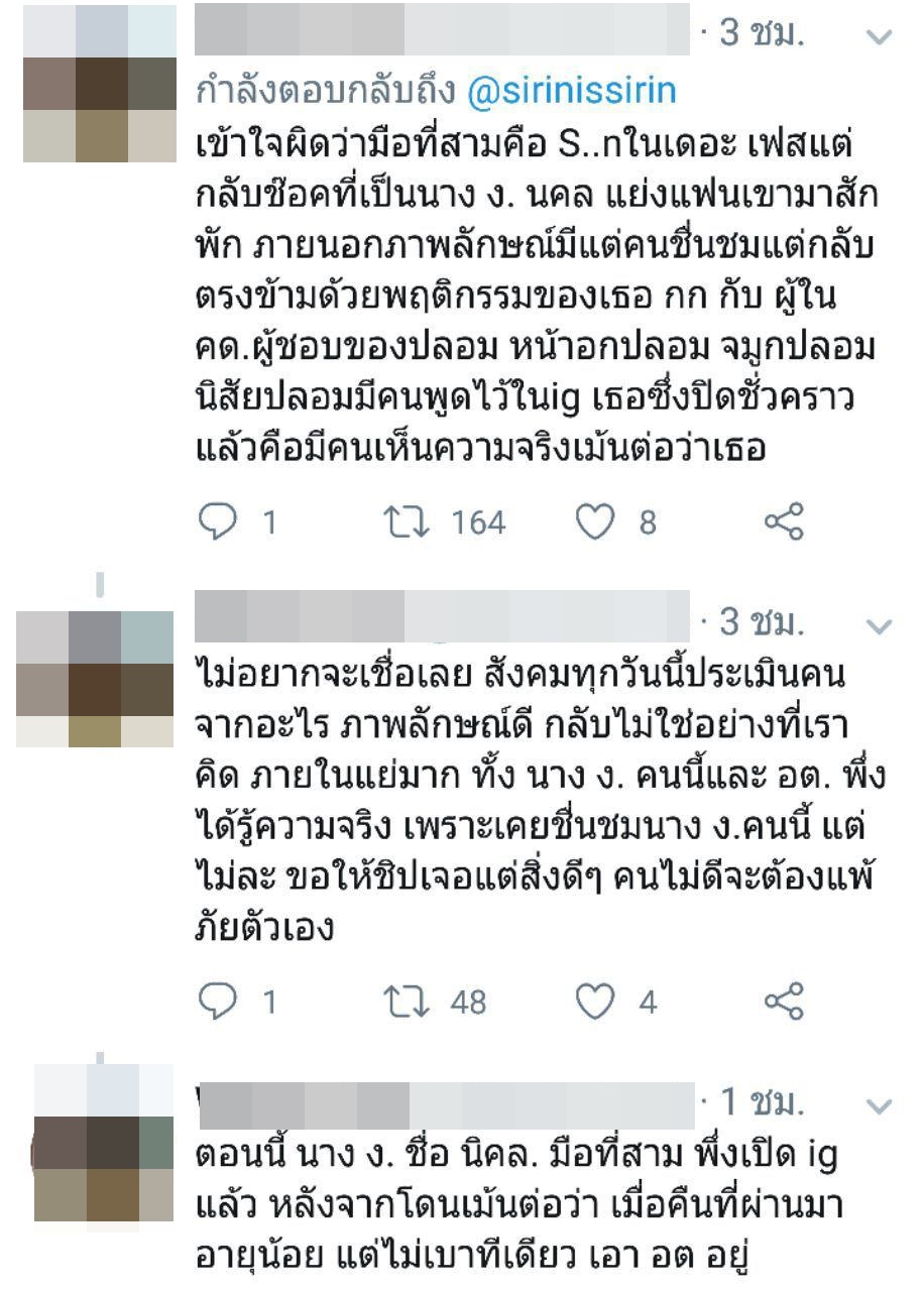โดยเมนชั่นดังกล่าวยังได้พูดถึงมือที่สามของความสัมพันธ์ดังกล่าวว่าไม่ใช่คนที่สื่อเคยออกข่าว แต่เป็นคนที่ใช้อักษรย่อ นาง ง. นคล ซึ่งภาพลักษณ์ภายนอกมีแต่คนชื่นชม แต่ภายในกลับมีพฤติกรรมตรงกันข้ามเลย อย่างไรก็ตาม ภายหลังเป็นที่วิพากษ์วิจารณ์ สาวชิปปี้ ก็ได้ลบข้อความดังกล่าวออกจากทวิตเตอร์ไปแล้ว