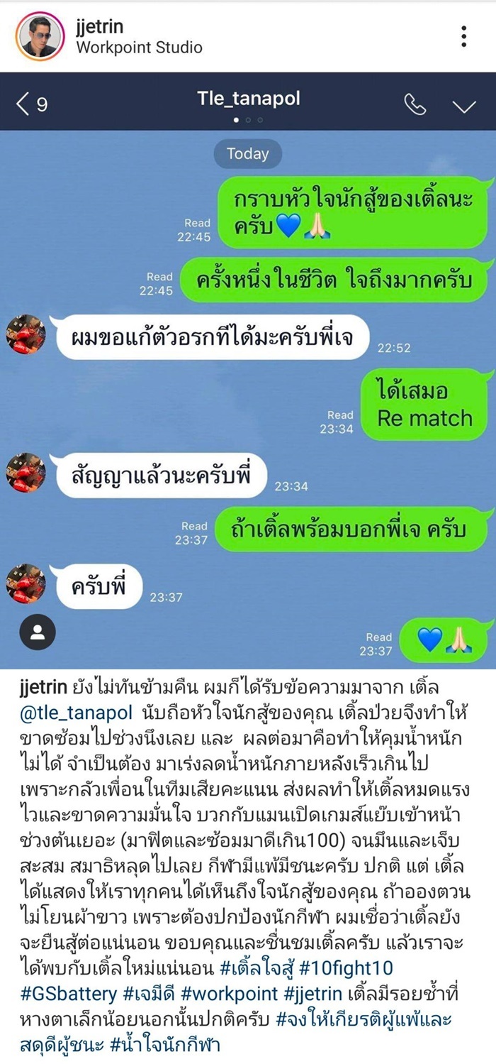 โดยล่าสุด (18 มิถุนายน 2562) เจ เจตริน โปรโมเตอร์ 10 Fight 10 ได้โพสต์แชตไลน์ที่คุยกับ เติ้ล ธนพล เล่าถึงความใจสู้ของเติ้ล ที่ทักเจมาเพื่อขอแก้ตัวอีกครั้ง ซึ่งทางเจก็รับปากให้รีแมตช์ หากเติ้ลพร้อมก็บอก พร้อมเผยถึงสาเหตุที่ทำให้เติ้ลขาดซ้อมช่วงหนึ่ง จนหมดแรงไว และขาดความมั่นใจในศึกที่ผ่านมา ดังนี้