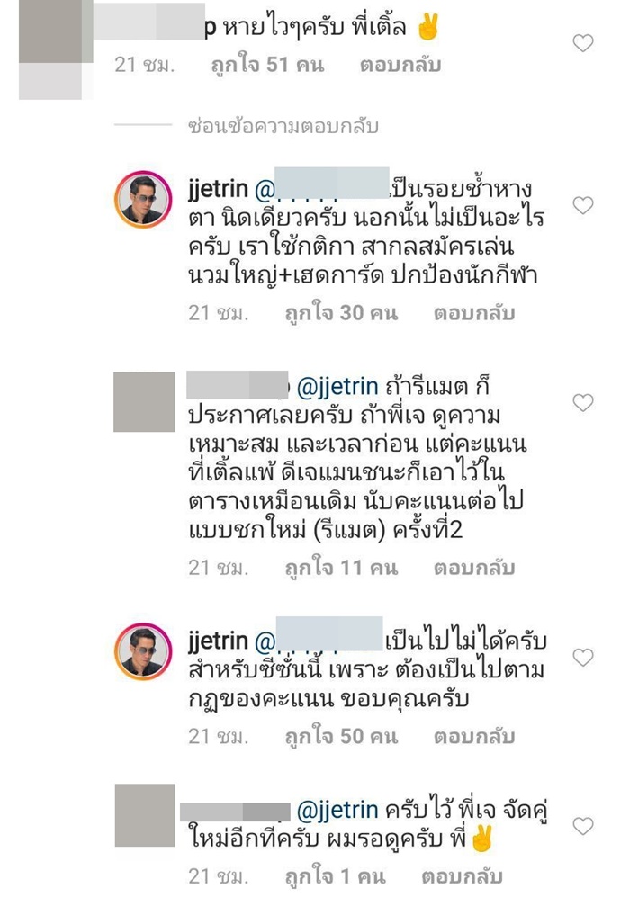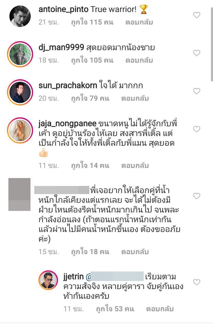 ทั้งนี้ เมื่อมีแฟนรายการแนะนำว่า อยากให้เลือกคู่ชกที่น้ำหนักใกล้เคียงกันตั้งแต่แรก จะได้ไม่ต้องมีฝ่ายไหนรีดน้ำหนักมากเกินไปจนพละกำลังอ่อนลงแบบนี้ ซึ่งทาง เจ เจตริน ก็ตอบกลับว่า "เรียนตามความสัตย์จริง หลายคู่ดารา จับคู่กันเอง ท้ากันเองครับ"