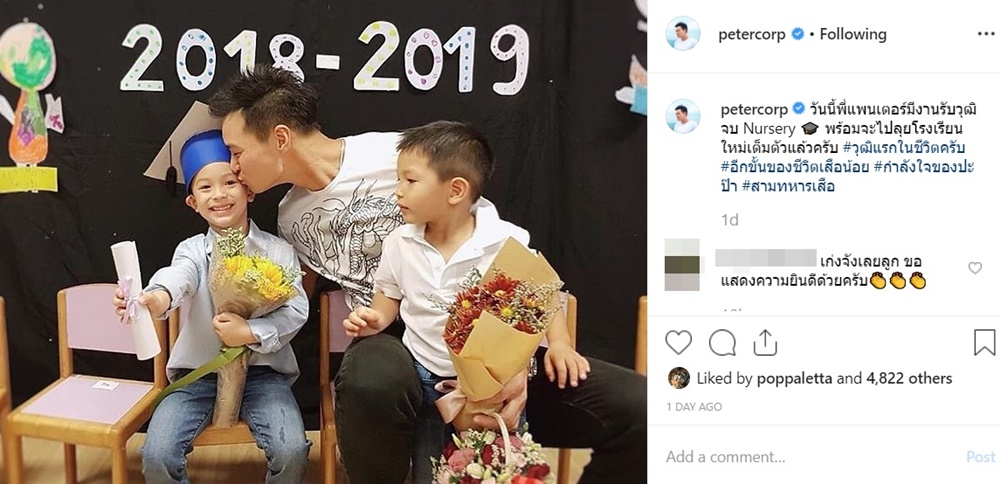 ทางด้าน ปีเตอร์ คอร์ป ไดเรนดัล ก็เผยภาพถ่ายกับลูกชายทั้ง 2 คน พร้อมข้อความว่า "วันนี้พี่แพนเตอร์มีงานรับวุฒิจบ Nursery พร้อมจะไปลุยโรงเรียนใหม่เต็มตัวแล้วครับ #วุฒิแรกในชีวิตครับ #อีกขั้นของชีวิตเสือน้อย #กำลังใจของปะป๊า #สามทหารเสือ"