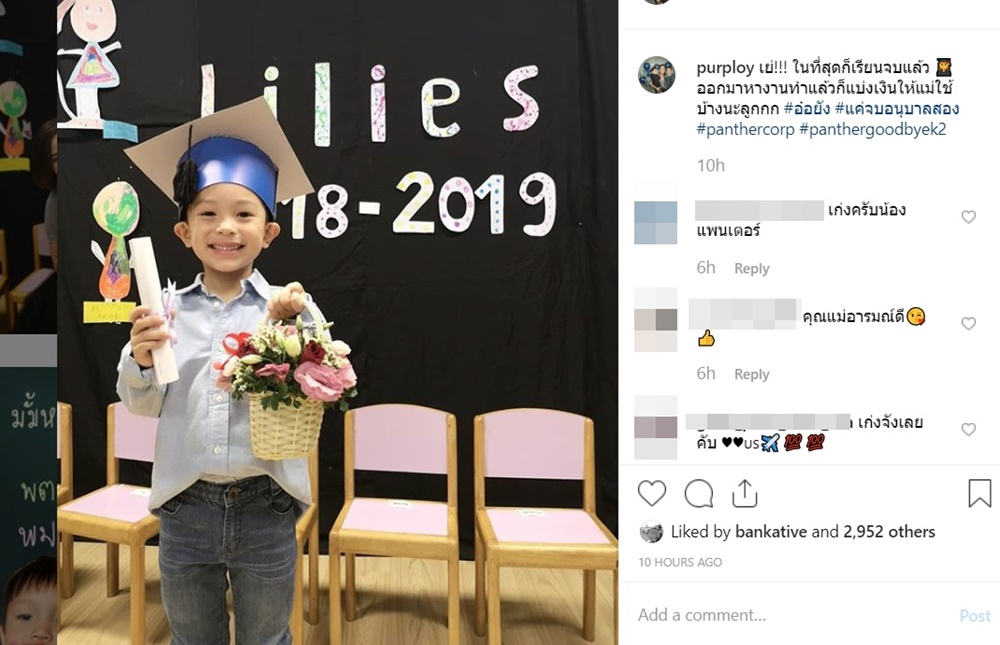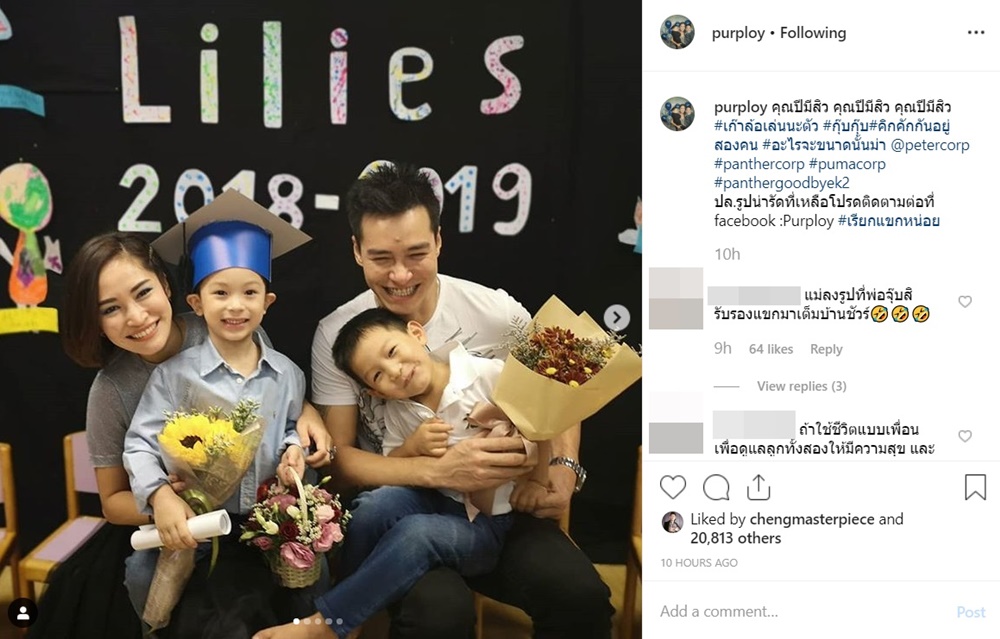 อย่างล่าสุด (20 มิถุนายน 2562) เมื่อ น้องแพนเตอร์ เรียนจบชั้นอนุบาล 2 พลอย ปีเตอร์ และ น้องพูม่า ก็ได้มาร่วมยินดีกันแบบพร้อมหน้า ส่งรอยยิ้มสดใสลง IG จนแฟนคลับเข้ามากดไลก์ ร่วมชื่นใจกันเพียบ