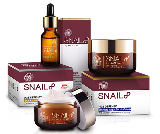 จากประสิทธิภาพของเมือกหอยทากสายพันธุ์ไทยนี้เอง จึงมีการต่อยอดจนเกิดเป็นผลิตภัณฑ์บำรุงผิว SNAIL8 ทั้งเซรั่มลดริ้วรอย SNAIL8 AGE DEFENSE Advanced Serum, ครีมบำรุงผิวกลางวัน SNAIL8 AGE DEFENSE Skin Repair Daily Cream และครีมบำรุงผิวกลางคืน SNAIL8 AGE DEFENSE Ultimate Night Repair Cream คุณค่าแท้เมือกหอยทากที่คัดเฉพาะเมือกแมนเทิล เมื่อใช้แล้ว ผิวหน้าก็จะเต่งตึง เรียบเนียน ยืดหยุ่นและชุ่มชื้นมากขึ้น ฝ้า กระ จุดด่างดำที่เคยมีก็จางลง เพราะอุดมไปด้วยสารสกัดอัลแลนโทอิน ไฮยาลูโรนิก ไกลโคลิก เปปไทด์ และโปรตีน มีโมเลกุลขนาดเล็ก ซึมซาบง่าย ช่วยคืนความอ่อนวัยให้ผิวด้วย 8 คุณประโยชน์ ทั้งลดเลือนริ้วรอยแห่งวัย, ฟื้นบำรุงผิวให้แข็งแรง, เผยผิวกระจ่างใส, ช่วยให้ผิวชุ่มชื้น, เพิ่มความยืดหยุ่น, กระชับรูขุมขน, ต่อต้านอนุมูลอิสระ และป้องกันการเกิดสิว ลดสิวอักเสบ เรียกได้ว่าผิวสวยเพอร์เฟกต์สมกับคอนเซ็ปต์ #ผิวสวยสยบทุกสรรพสิ่ง กันไปเลย
