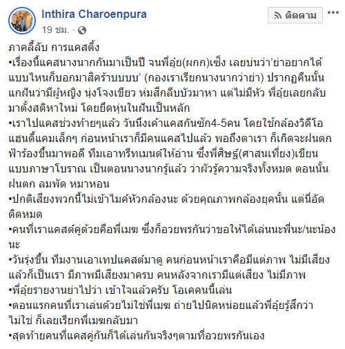 ตอนนั้นมีฝนตก ลมพัด หมาหอน แต่ปกติเสียงพวกนี้จะไม่เข้าไมค์หัวกล้อง เพราะด้วยคุณภาพของกล้องยุคนั้น แต่สำหรับเราอัดเสียงติดหมด ตอนนั้นตนได้แคสคู่กับพี่เมฆ วินัย ไกรบุตร เราก็อวยพรกันและกัน ว่าขอให้ได้เล่นนะพี่นะ ขอให้ได้เล่นนะน้อง