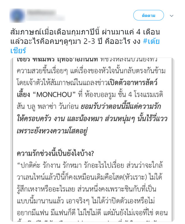 ทั้งหมดนี้ ทำให้แฟนคลับหลายคนถึงกับงงไปตามกัน เพราะ 4 เดือนที่แล้วยังบอกโสดสนิท ไม่มีใครจีบ แต่สัมภาษณ์ล่าสุดบอกไฮโซบิ๊ก ทำดีด้วยมาตลอด 2 ปีที่ผ่านมา หลายคนจึงรู้สึกผิดหวังโดยเฉพาะเหล่าลูกหมี ที่ติดตามคู่จิ้น พ่อหมี - แม่หมี มานานกว่า 3 ปี