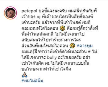 ขณะที่ทาง "พีท พล" ได้ระบุถึงประเด็นดังกล่าวผ่านอินสตาแกรมส่วนตัว petepol ว่า ตนเองสนิทกับคนโพสต์ภาพดังกล่าว และตนเองก็คอมเมนต์ใส่ไอคอนตลก เพราะรู้สึกว่าสิ่งที่พี่เค้าโพสต์ตลกดี ไม่ได้มีเจตนาไปสนับสนุนให้ไปทำร้ายร่างกายใคร ส่วนที่ตนโพสต์ #คางทูม เพราะรู้สึกขำ ไม่ได้มีเจตนาจะ bully แต่อย่างใด ขอโทษหากทำให้เข้าใจผิด พร้อมยืนยันว่าตนไม่ใช่สลิ่ม
