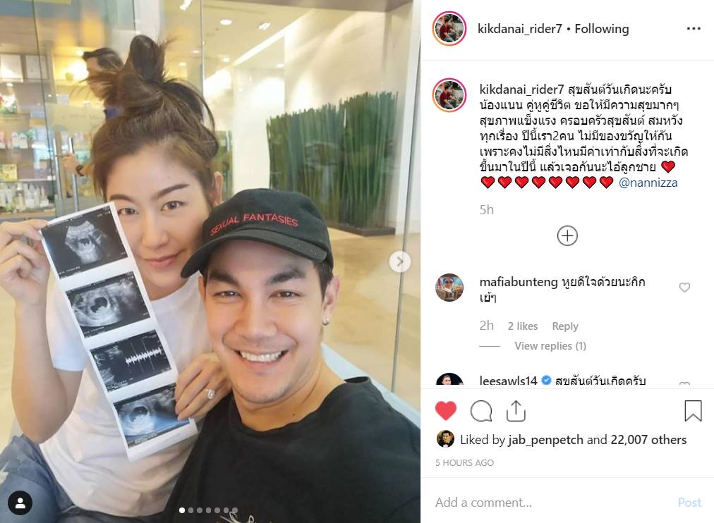ทั้งนี้ กิก ดนัย ได้โพสต์ภาพคู่กับภรรยา โชว์ภาพอัลตราซาวด์ พร้อมข้อความว่า "สุขสันต์วันเกิดนะครับน้องแนน คู่หูคู่ชีวิต ขอให้มีความสุขมาก ๆ สุขภาพแข็งแรง ครอบครัวสุขสันต์ สมหวังทุกเรื่อง ปีนี้เรา 2 คน ไม่มีของขวัญให้กัน เพราะคงไม่มีสิ่งไหนมีค่าเท่ากับสิ่งที่จะเกิดขึ้นมาในปีนี้ แล้วเจอกันนะไอ้ลูกชาย"