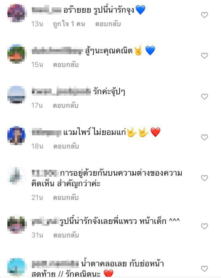 อย่างไรก็ตาม มีแฟนคลับจำนวนมากแห่คอมเมนต์ให้กำลังใจ บอกจะสนับสนุนนักร้องสาวต่อไป นอกจากนี้ หลายคนยังหลุดโฟกัสจากข้อความของเธอ ไปโฟกัสที่ความน่ารักสดใสและความหน้าเด็กของสาวแพรว ที่แม้อายุย่าง 35 ปีแล้ว แต่ยังดูหน้าเด็กตลอดกาล