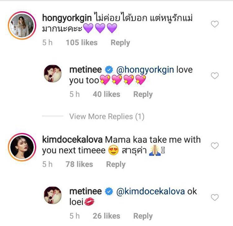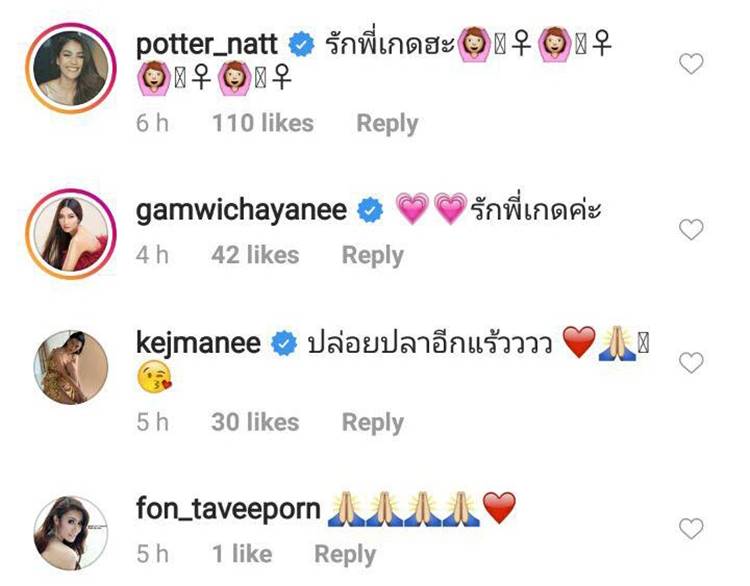ซึ่งเหล่าคนดังก็เข้ามาคอมเมนต์กันเพียบ ไม่ว่าจะเป็น แนท อนิพรณ์ เจ้าของตำแหน่ง Miss Thailand Universe 2015 แก้ม วิชญาณี ปิ่น เก็จมณี น้ำฝน ทวีพร รวมไปถึง หงส์ The Face และ คิมมี่ คิม โดเชคาโลวา สาวงามผู้ติดอันดับ Top 5 Miss Thailand Universe 2019