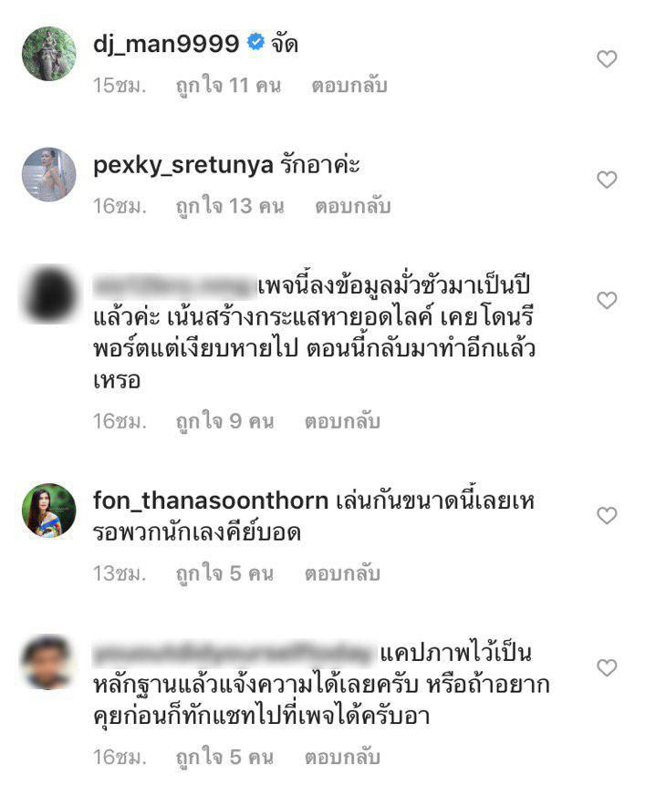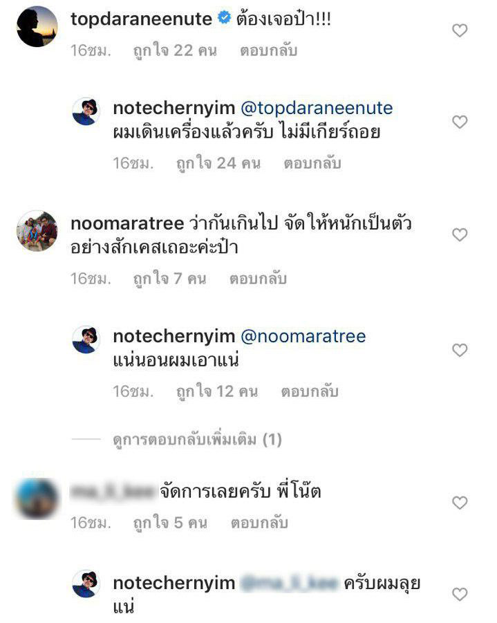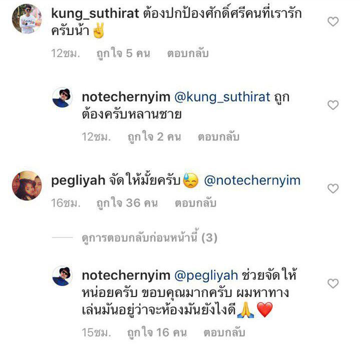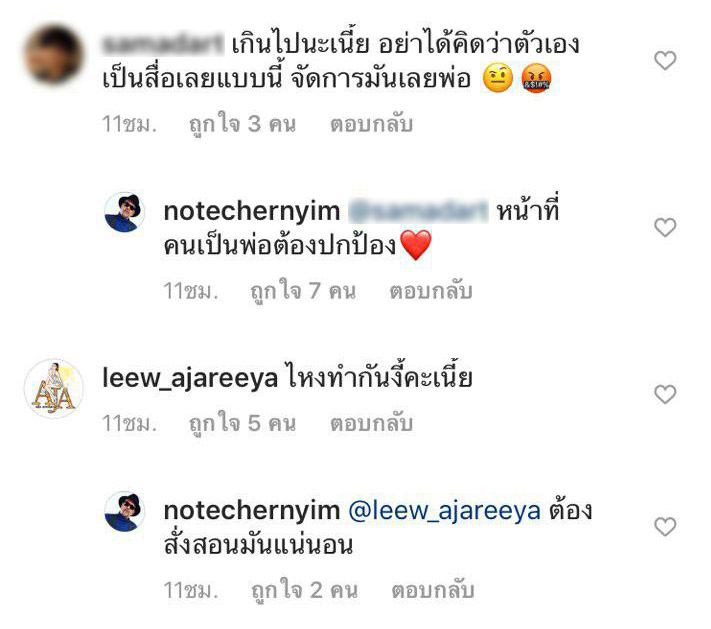 ต่อมาคนดังในแวดวงบันเทิงหลายคนก็เข้ามาคอมเมนต์ ไม่ว่าจะเป็น เป็ก สัณณ์ชัย สามีของ ธัญญ่า ธัญญาเรศ เข้ามาถามว่า จัดให้ไหมครับ ซึ่งโน้ตก็ตอบกลับไปว่า ช่วยหน่อยครับ ผมหาทางจัดการมันอยู่ นอกจากนี้ยังมีดีเจแมน พัฒนพล, หลิว อาจารียา, ฝน ธนสุนทร และ ท็อป ดารณีนุช ที่เข้ามาคอมเมนต์ให้จัดการแบบจัดหนักเพื่อเป็นกรณีตัวอย่าง ซึ่งตลกดังก็ประกาศว่า เดินเครื่องแล้วไม่มีเกียร์ถอย ทำหน้าที่ของคนเป็นพ่อที่ต้องปกป้องลูก