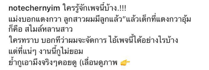 ล่าสุด (13 กรกฎาคม 2562) โน้ต เชิญยิ้ม ไม่อยู่เฉยแน่นอน นำภาพจากกระทู้ดังกล่าวโพสต์เดือดลงอินสตาแกรม ระบุว่า "ใครรู้จักเพจนี้บ้าง ! แม่งบอกแตงกวา ลูกสาวผมมีลูกแล้ว ซึ่งเด็กที่แตงกวาอุ้มก็คือ สไมล์ หลานสาว ใครทราบบอกทีว่าผมจะจัดการไอ้เพจนี้ได้อย่างไรบ้าง แต่ที่แน่ ๆ งานนี้กูไม่ยอม ย้ำกูเอามึงจริง ๆ คอยดู"