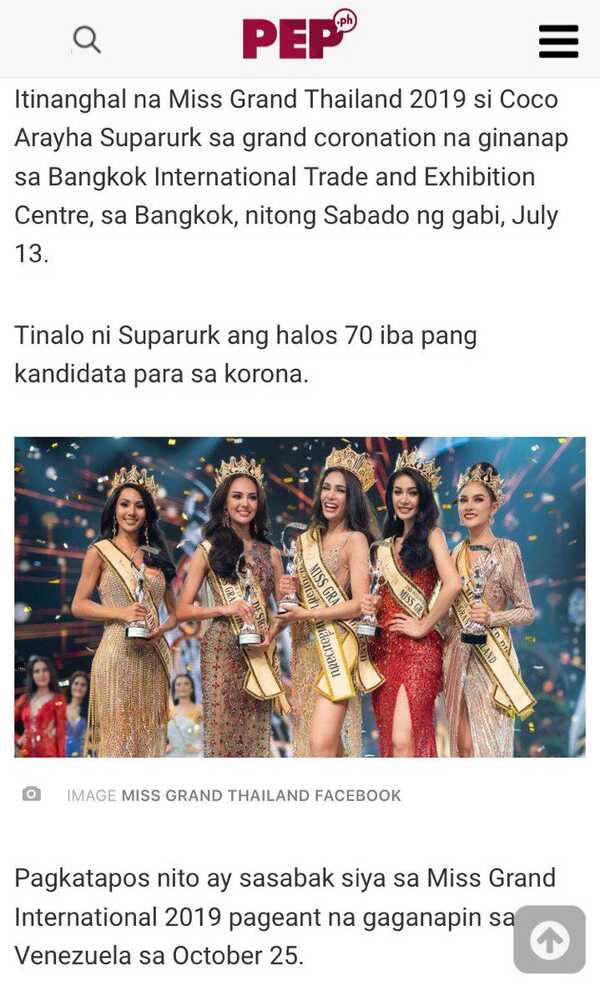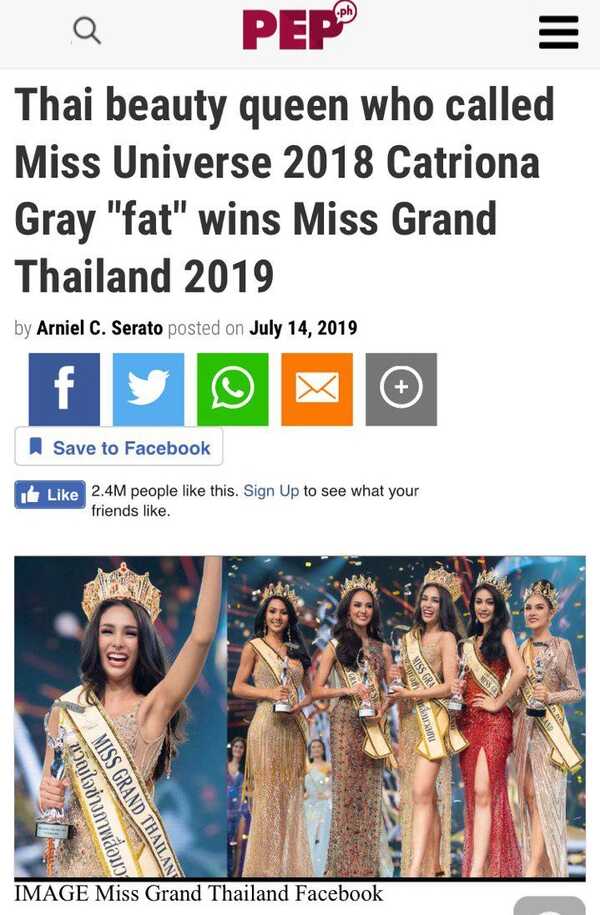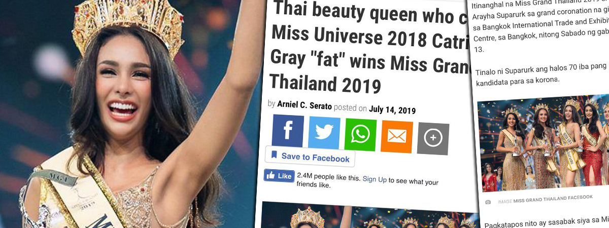 โดยข้อความระบุที่ภาพของ คลารา โซซา ว่า FIT (พอดี) ส่วนข้อความที่ภาพของ แคทริโอนา เกรย์ ระบุว่า FAT (อ้วน) นำมาซึ่งความไม่พอใจจากบรรดาแฟนนางงามฟิลิปปินส์ และโกโก้ ตกเป็นเป้าถูกกระหน่ำต่อว่าอย่างรุนแรง แต่สุดท้ายเธอก็สามารถคว้ามงกุฎ มิสแกรนด์ไทยแลนด์ 2019 มาครองได้ในที่สุด สวนทุกกระแสดราม่า