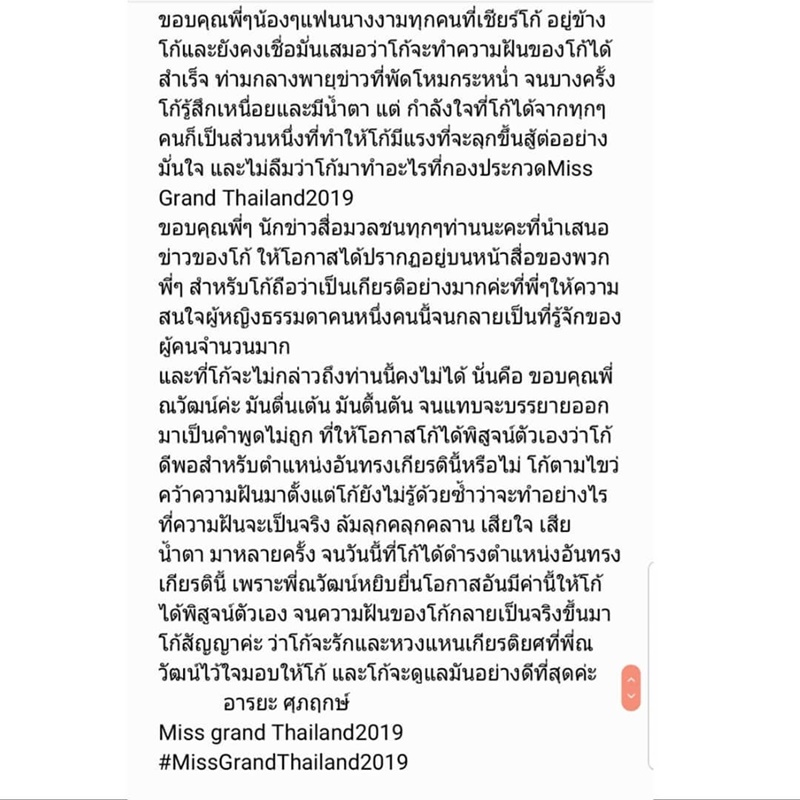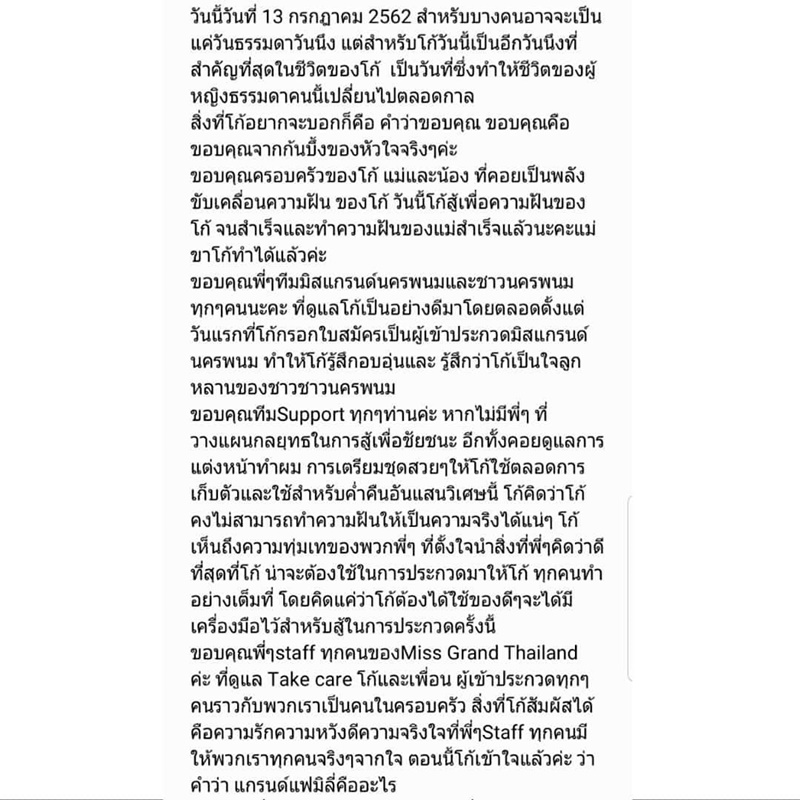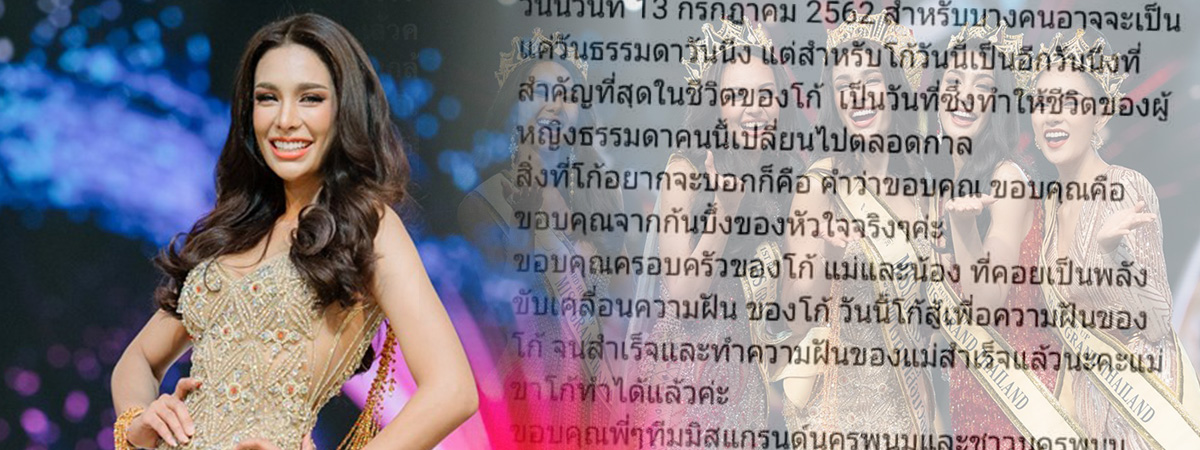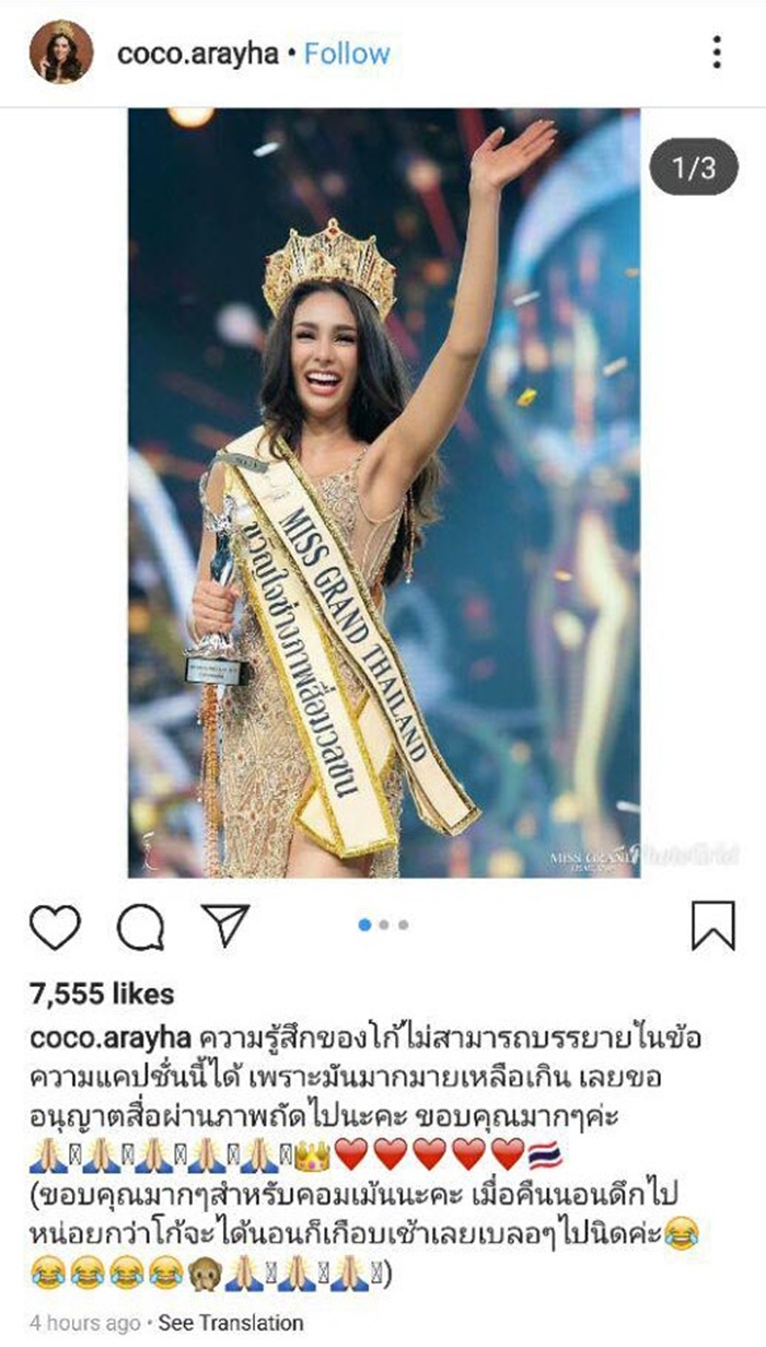 ล่าสุด วันที่ 14 กรกฎาคม 2562 โกโก้ ก็ได้โพสต์อินสตาแกรมเผยความรู้สึก หลังจากมงลงได้เป็นมิสแกรนด์ไทยแลนด์ โดยเจ้าตัวกล่าวขอบคุณทุก ๆ คนที่เป็นกำลังใจให้ ไม่ว่าจะเป็นครอบครัว ทีมพี่เลี้ยง รวมทั้งชาวนครพนมที่ส่งแรงใจสนับสนุน วันนี้เธอต่อสู้เพื่อความฝันได้สำเร็จแล้ว และเข้าใจอย่างลึกซึ้งในความหมายของ แกรนด์แฟมิลี่ เพราะทีมงานทุกคนมอบความรัก ความหวังดี ความจริงใจให้กับเธอและผู้ประกวดทุกคน จนได้มีวันนี้