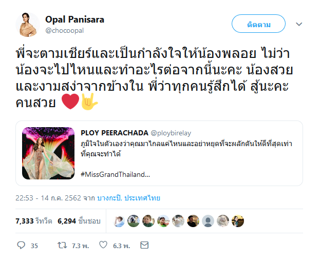 ล่าสุด (14 กรกฎาคม 2562) โอปอล์ ได้ออกมาโควทข้อความให้กำลังในทวิตเตอร์ของ พลอย ว่า "พี่จะตามเชียร์และเป็นกำลังใจให้น้องพลอย ไม่ว่าน้องจะไปไหนและทำอะไรต่อจากนี้นะคะ น้องสวยและงามสง่าจากข้างใน พี่ว่าทุกคนรู้สึกได้ สู้นะคะคนสวย" งานนี้ก็มีแฟน ๆ นางงามเข้าไปกดรีทวีตและไลก์เป็นจำนวนมาก