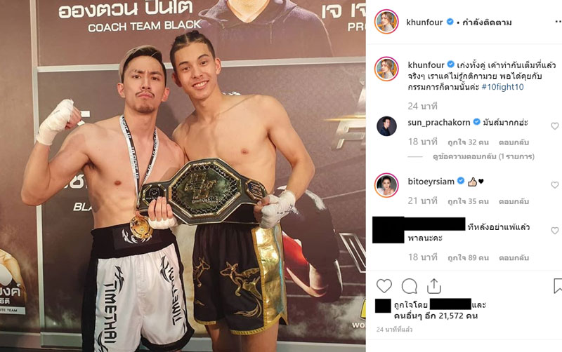 ก่อนที่ต่อมาสาวโฟร์ จะโพสต์ภาพ ธามไท และ โดม พร้อมข้อความว่า "เก่งทั้งคู่ เค้าทำกันเต็มที่แล้วจริง ๆ เราแค่ไม่รู้กติกามวย พอได้คุยกับกรรมการก็ตามนั้นค่ะ #10fight10"