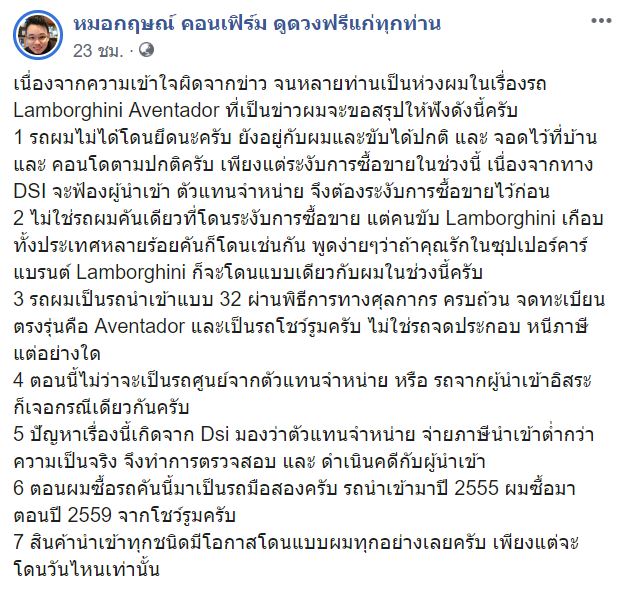 ทั้งนี้ จากข่าวดังกล่าว ทำให้มีคนเข้าใจผิดไปว่า หมอกฤษณ์ คอนเฟิร์ม โดนยึดรถหรู ล่าสุด (16 กรกฎาคม 2562) เจ้าตัวจึงได้ออกมาชี้แจงผ่านเฟซบุ๊กถึงเรื่องที่เกิดขึ้น โดยยืนยันว่ารถไม่ได้โดนยึด ยังอยู่กับตัวเอง ขับได้ตามปกติ เพียงแต่ระงับการซื้อขายเท่านั้น และมีเจ้าของรถแลมโบกินี่เกือบทั่วประเทศ ที่โดนแบบนี้ด้วยเช่นกัน