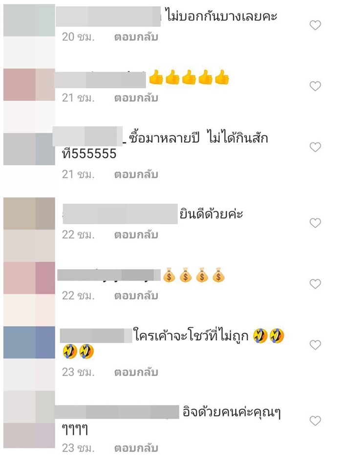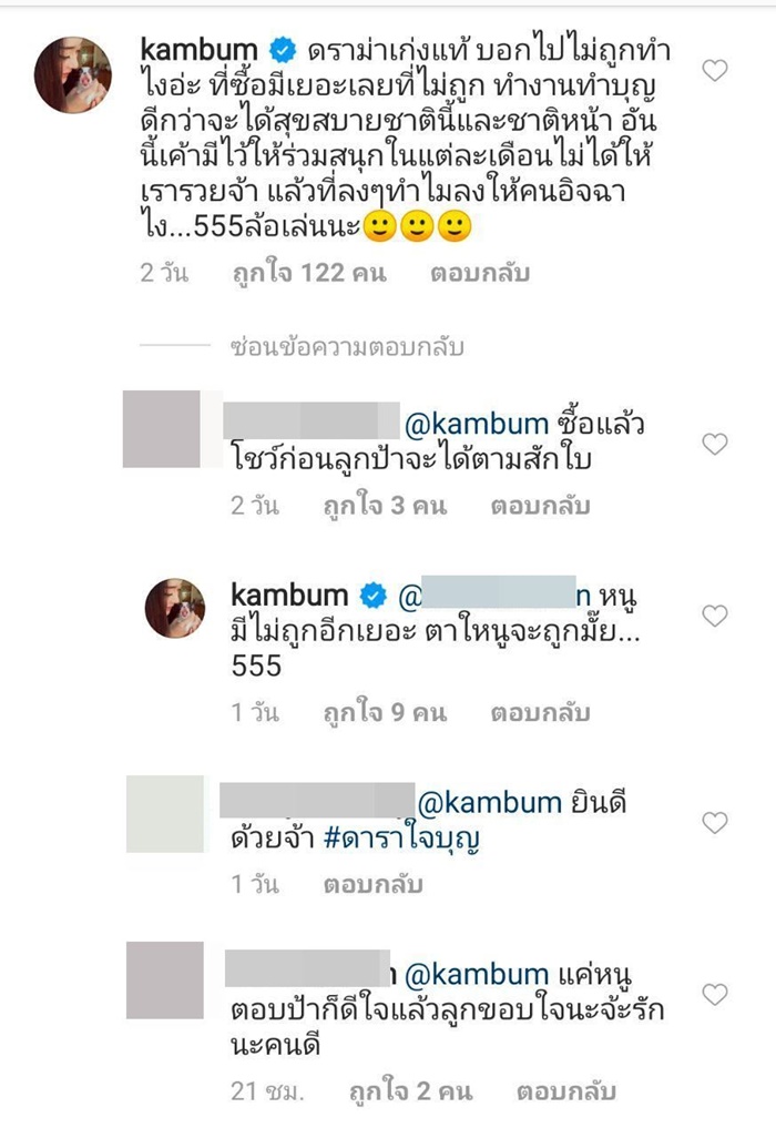ทั้งนี้ เมื่อมีคนเข้ามาบอกว่า "ซื้อแล้วโชว์ก่อนลูก ป้าจะได้ตามสักใบ" แก้มบุ๋ม ก็ตอบกลับไปว่า "หนูมีไม่ถูกอีกเยอะ ตามหนูจะถูกมั้ย...555"
