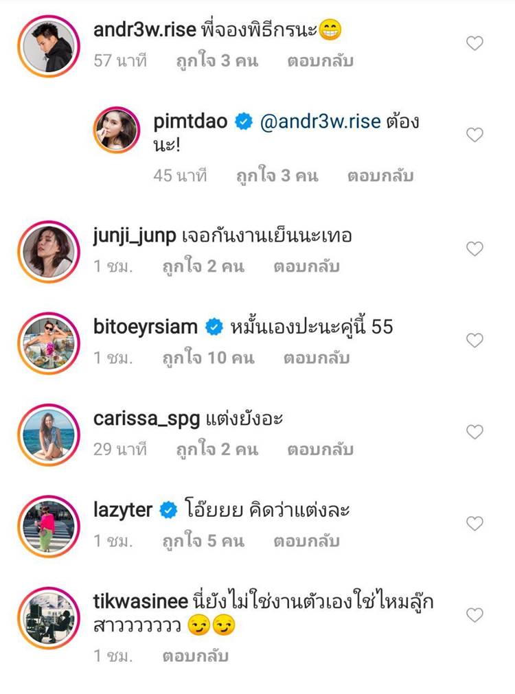 งานนี้ก็มีเพื่อน ๆ เข้ามาแซว ว่าคู่ของ พอร์ช ดาว หมั้นเองหรือเปล่า เห็นแล้วนึกว่าแต่งเอง ซึ่งภาพดังกล่าว เป็นภาพที่ ดาว พิมพ์ทอง และ พอร์ช ศรัณย์ ไปร่วมแสดงความยินดี ในงานมงคลสมรสของคู่รัก เป้ พีระยุทธ และ หมอมาศ ไม้ประเสริฐ นั่นเอง