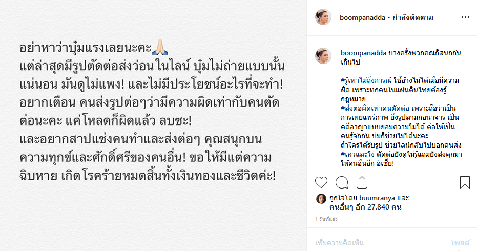 พร้อมทั้งยังบอกอีกว่า "บางครั้งพวกคุณก็สนุกกันเกินไป #รู้เท่าไม่ถึงการณ์ ใช้อ้างไม่ได้เมื่อมีความผิด เพราะทุกคนในแผ่นดินไทยต้องรู้กฎหมาย #ส่งต่อผิดเท่าคนตัดต่อ เพราะถือว่าเป็นการเผยแพร่ภาพ ยิ่งรูปลามกอนาจาร เป็นคดีอาญาแบบยอมความไม่ได้ ต่อให้เป็นคนรู้จักกัน บุ๋มก็ช่วยไม่ได้นะคะ ถ้าใครได้รับรูป ช่วยไลน์กลับไปบอกคนส่ง #เลวและโง่ ตัดต่อยังดูไม่รู้แถมยังส่งคุกมาให้คนอื่นอีก อิเ_ย !"