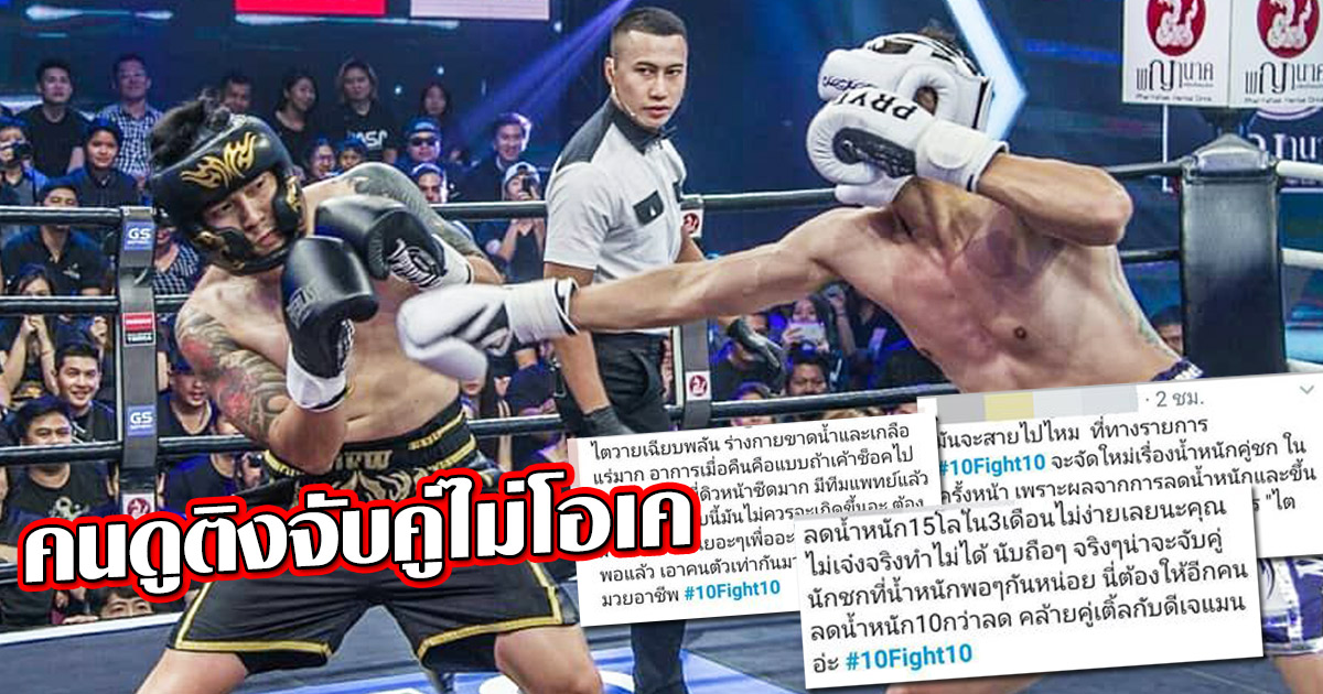 ทำเอาผู้ชมรายการ 10 Fight 10 วิจารณ์กันสนั่น จนแท็ก #10Fight10 แทบเดือด !! กับการจับคู่ชกของรายการ ที่นักชกทั้ง 2 ฝั่ง น้ำหนักไม่บาลานซ์กัน จนเหมือนชกข้ามรุ่น ทำให้มีฝ่ายหนึ่งต้องโหมลดน้ำหนักในเวลาสั้น ๆ จนร่างกายไม่พร้อม เสียเปรียบตอนชก แถมถ้าลดไม่ได้ตามเป้า ก็โดนหักคะแนน ทำให้อีกฝ่ายได้คะแนนไปฟรี ๆ อีกต่างหาก